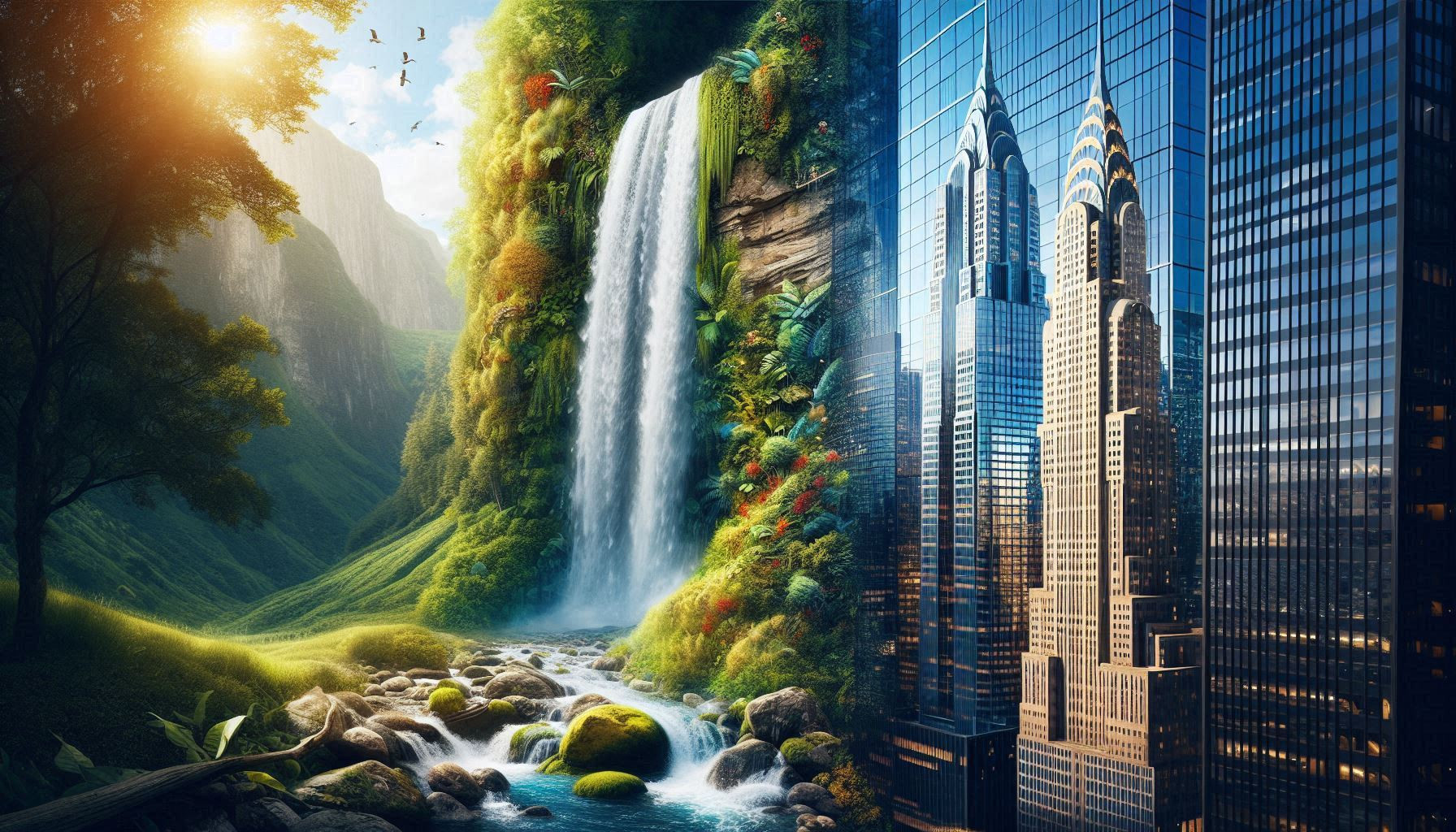 - Vergleich: Der Vergleich kann die Spannung zwischen dem Evergreen der Natur und dem oft temporären Charakter menschlicher Bauten darstellen. Oder man kann das Konzept der biophilen Architektur, die Natur in Gebäude integriert, visuell darstellen.