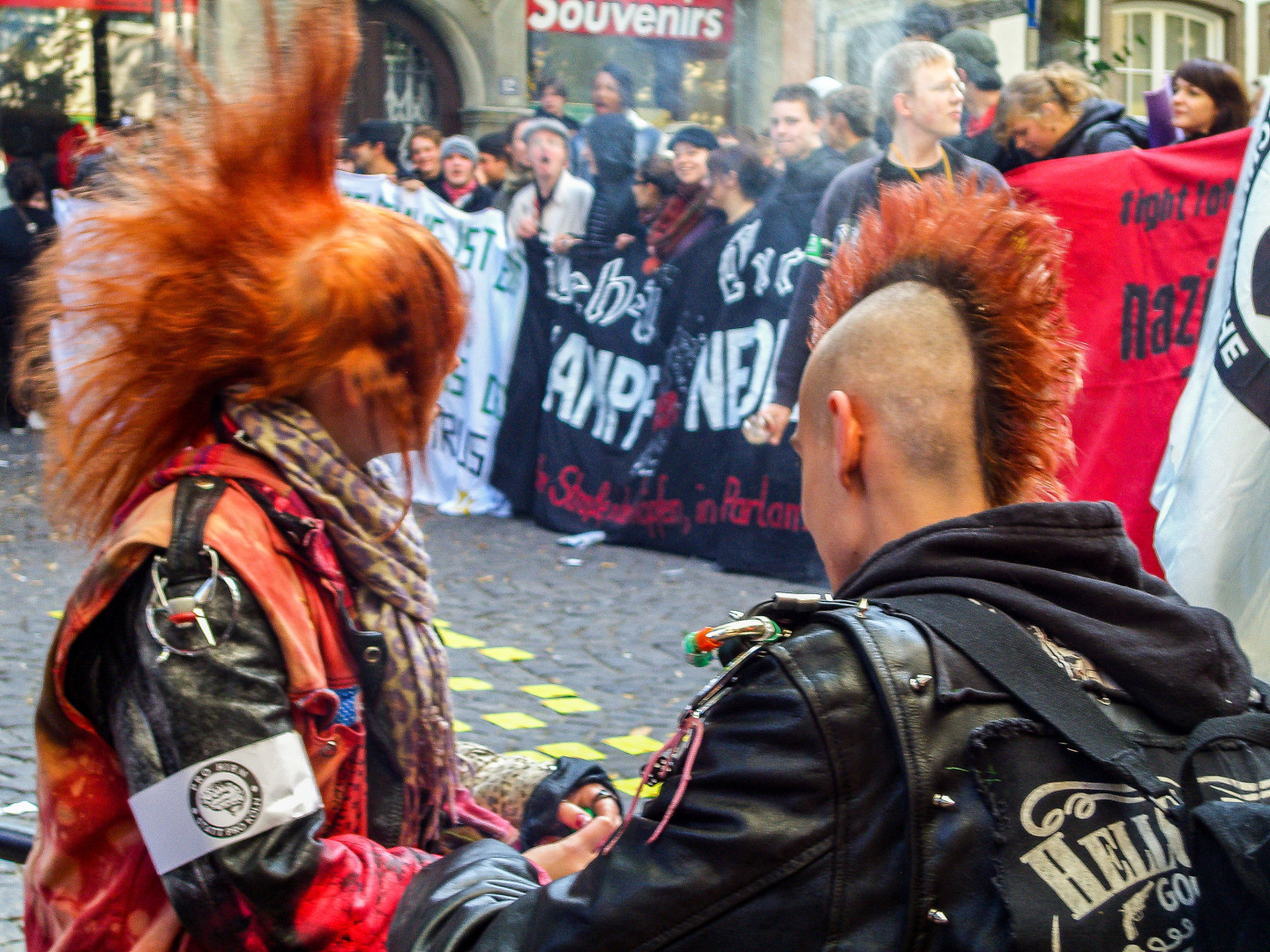 Alexander Supp | March 2, 2026Alle Macht den Chaoten! Gibt es ein positives Wort für chaotisch? Die zehn wichtigsten positiven und wirkungsvollen Synonyme für „chaotisch“ sind: dynamisch, lebendig, unberechenbar, temperamentvoll, geschäftig, aufregend, rasant, abenteuerlustig, lebhaft und transformativ. Die Verwendung dieser Synonyme hilft Ihnen, Ihre Kommunikationsfähigkeit und Ihre psychische Widerstandsfähigkeit auf vielfältige und sinnvolle Weise zu stärken.Alexander Supp | March 2, 2026Dazu meint Google-KI am 02.03.2026: Das Bild zeigt zwei Personen der Punk-Subkultur bei einer Demonstration, erkennbar an ihren markanten Irokesenschnitten (Mohawks) und typischer Kleidung. Der Hintergrund mit Bannern wie „Tight for Nazi“ deutet auf eine antifaschistische oder politische Versammlung hin. Stil und Merkmale Die zentralen Elemente des Punk-Stils in diesem Bild sind: Haare: Beide Personen tragen einen Irokesenschnitt. Eine Person hat leuchtend rotes, aufgestelltes Haar, die andere trägt einen klassischen, rasierten Irokesenschnitt in Rot-Orange. Kleidung: Zu sehen sind schwarze Lederjacken mit typischen Verzierungen wie Nieten und Aufnähern. Accessoires: Eine Person trägt einen Schal mit Leopardenmuster, ein häufiges Element in der Punk-Mode. An der Jacke sind zudem Sicherheitsnadeln und Anstecker befestigt. Ähnliche Modeartikel Wenn du diesen Stil nachstylen möchtest, findest du hier passende Artikel: Leopard-Schals: Marken wie Codello oder FRAAS bieten ähnliche Muster an. Leder-Accessoires: Schwarze Ledertaschen oder Rucksäcke mit Nieten ergänzen den Look. DIY-Material: Für Kostüme oder individuelle Anpassungen werden oft gefärbte Federn oder spezielle Haarpflegeprodukte verwendet.Alexander Supp | March 2, 2026Auf den Bannern im Hintergrund sind klare politische Statements der Anti-Nazi-Bewegung zu sehen, die typisch für Punk-Demonstrationen sind. Slogans und ihre Bedeutung Die Banner dienen dazu, Haltung zu zeigen und Solidarität innerhalb der Subkultur auszudrücken: „Fight for ...“ / „Fight Nazis“: Auch wenn ein Teil des Textes verdeckt ist (man liest „Tight for“ oder „Fight for“), ist der Bezug zu „Nazis“ eindeutig. Es handelt sich um einen Aufruf zum aktiven Widerstand gegen rechtsextreme Ideologien. Slogans wie dieser sollen die Öffentlichkeit überzeugen und Gleichgesinnte mobilisieren. Antifaschistische Symbole: Die Farbkombination aus Rot, Schwarz und Weiß auf den Bannern wird häufig von antifaschistischen Gruppen genutzt, um ihre Ablehnung von Faschismus und Rassismus zu signalisieren. „Kein Bock auf Nazis“: Dies ist eine der bekanntesten Punk-Initiativen in Deutschland, die seit Jahrzehnten Jugendliche gegen Rechts mobilisiert. Banner dieser Art sind fester Bestandteil solcher Demonstrationen. Politische Botschaft In der Punk-Subkultur ist die politische Ausrichtung meist antiautoritär, antifaschistisch und links geprägt. Die Slogans verdeutlichen die radikale Ablehnung von Nationalismus, Rassismus und bürgerlichen Konventionen.Alexander Supp | March 2, 2026Die Punk-Bewegung in Deutschland hat eine bewegte Geschichte, die eng mit politischem Protest und gesellschaftlicher Provokation verknüpft ist. Ursprünge und die erste Welle (Ende der 70er) Inspiriert durch Bands aus London (wie die Sex Pistols) und New York, erreichte der Punk Mitte der 1970er Jahre Deutschland. Erste Bands: Zu den Pionieren gehörten Big Balls and the Great White Idiot (Hamburg, 1975), Male (Düsseldorf, 1976) und PVC (West-Berlin, 1977). Merkmale: In Kellern wurde „Pogo“ getanzt, die Mode war durch zerrissene Kleidung und Sicherheitsnadeln geprägt – ein krasser Gegenentwurf zu den damaligen gesellschaftlichen Normen. Politisierung und die 80er Jahre In den 1980er Jahren entwickelte sich der Punk zu einer ernstzunehmenden politischen Kraft in der Bundesrepublik. Themen: Die Texte drehten sich oft um die Nazi-Vergangenheit Deutschlands, Polizeigewalt, die Rechte von Hausbesetzern und die Hoffnungslosigkeit der Arbeiterklasse. Bands wie Slime, Hass oder Daily Terror prägten diesen „Politpunk“. Aktionen: Bewegungen wie die „Freizeit 81“ in München störten das bürgerliche Leben durch unangemeldete Demos und radikale Aktionen. Punk in der DDR: Auch im Osten gab es eine lebendige Punkszene, die jedoch massiv von der Stasi überwacht und unterdrückt wurde, da sie als „staatsfeindlich“ galt. Entwicklung bis heute Obwohl Punk Ende der 90er oft für „tot“ erklärt wurde, blieb er als Subkultur bestehen. Mainstream vs. Underground: Viele Elemente wie gefärbte Haare oder Piercings sind heute Teil der alltäglichen Mode geworden. Kernwerte: Die Grundhaltung bleibt oft antiautoritär, antifaschistisch und systemkritisch. Die „Do-it-yourself“-Ethik (DIY) – also das Selbermachen statt Kaufen – ist nach wie vor ein zentraler Pfeiler.Nazis raus!Nazis raus!Image Uploaded By: Stephan TewesAutor: Stephan Tewes